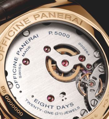 Hand-wound mechanical, P.5000 calibre, executed entirely by Panerai, 15 ½ lignes, 4.5 mm thick, 21 jewels, Glucydur® balance, 21,600 alternations/hour. KIF Parechoc® anti-shock device. Power reserve 8 days, two barrels. 127 components.